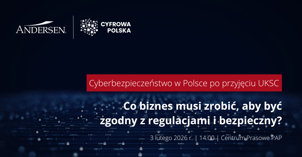 Andersen w Polsce oraz Związek Cyfrowa Polska mają przyjemność zaprosić Państwa do udziału w wydarzeniu stacjonarnym, podczas którego eksperci naświetlą i usystematyzują nowe obowiązki i wymagania wynikające z UKSC oraz wyjaśnią jakie działania w obszarach organizacji, technologii i prawa muszą podjąć przedsiębiorcy i sektor publiczny.